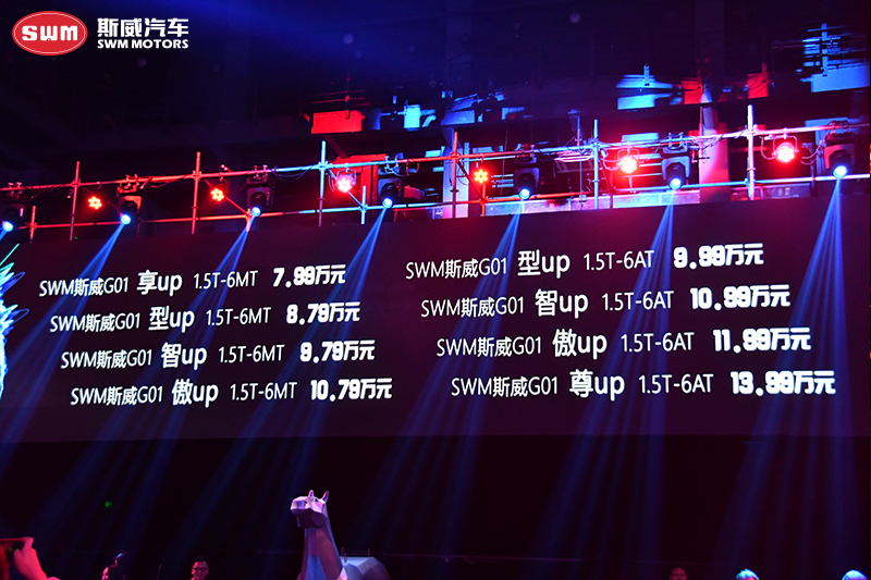 8月29日,SWM斯威汽車G01全球上市發布會在成都東郊記憶舉辦,斯威汽車全新戰略車型——“型動·智能SUV”SWM斯威G01驚艷上市。新車由世界頂尖汽車造型設計師科沃斯領銜設計,國際質量大師高爾曼品質管控,共推出1.5T手動 享up、型up、智up、傲up和1.5T自動 型up、智up、傲up、尊up 8款車型,售價7.99-13.99萬元。搭載1.5T 6MT/6AT動力組合,配備多項智能“黑科技”,斯威G01專為都市青年一族量身定制,將帶來不一Young的“Go.智、Go.酷、Go.大、Go.爽”型智駕乘體驗。