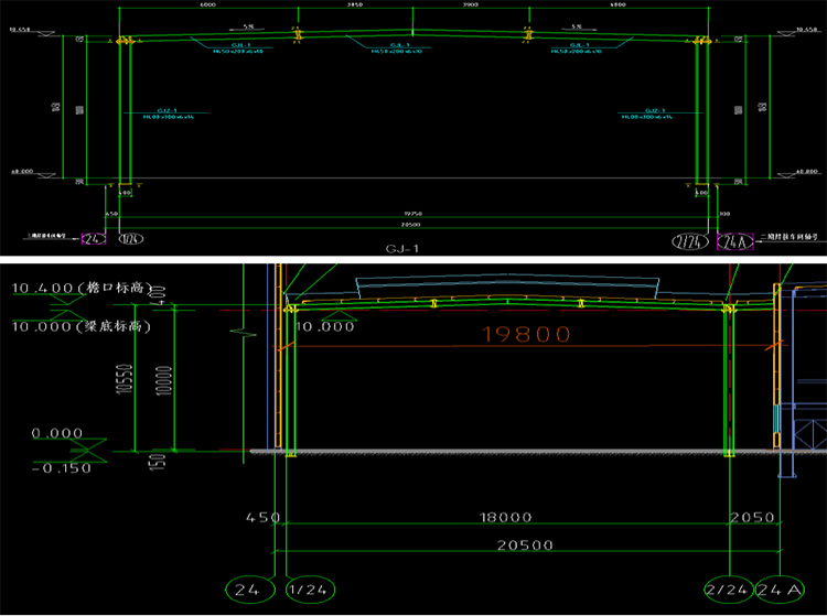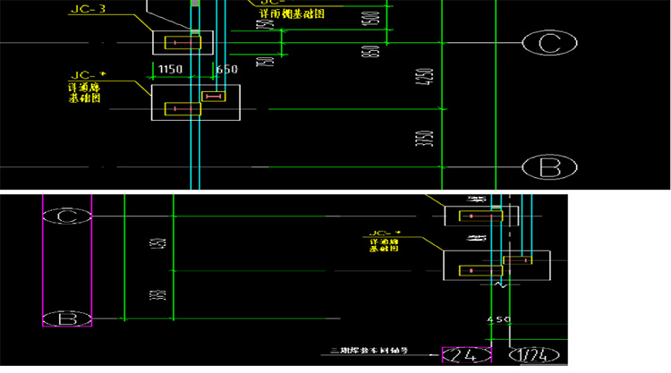 34、零部件焊接廠房結(jié)構(gòu)圖,基礎(chǔ)平面圖中○24/○B(yǎng)~○C軸線基礎(chǔ)引出標(biāo)識為詳通廊基礎(chǔ)圖,而雨棚結(jié)構(gòu)圖基礎(chǔ)平面圖(二)中此位置注明詳通廊基礎(chǔ)圖,此處基礎(chǔ)及短柱具體做法?