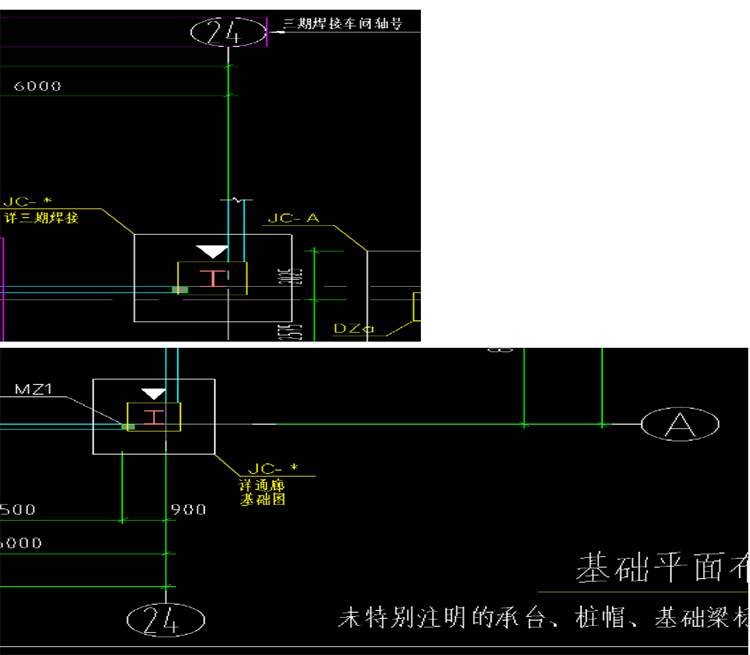 33、零部件焊接廠房結(jié)構(gòu)圖,基礎(chǔ)平面圖中○24/○A軸基礎(chǔ)引出標(biāo)識為詳通廊基礎(chǔ)圖,而雨棚結(jié)構(gòu)圖基礎(chǔ)平面圖(一)中此位置注明詳三期焊接,基礎(chǔ)平面圖(二)中無此處基礎(chǔ),此處基礎(chǔ)及短柱具體做法?